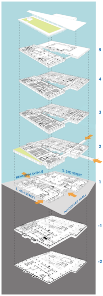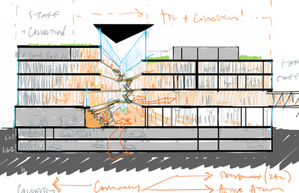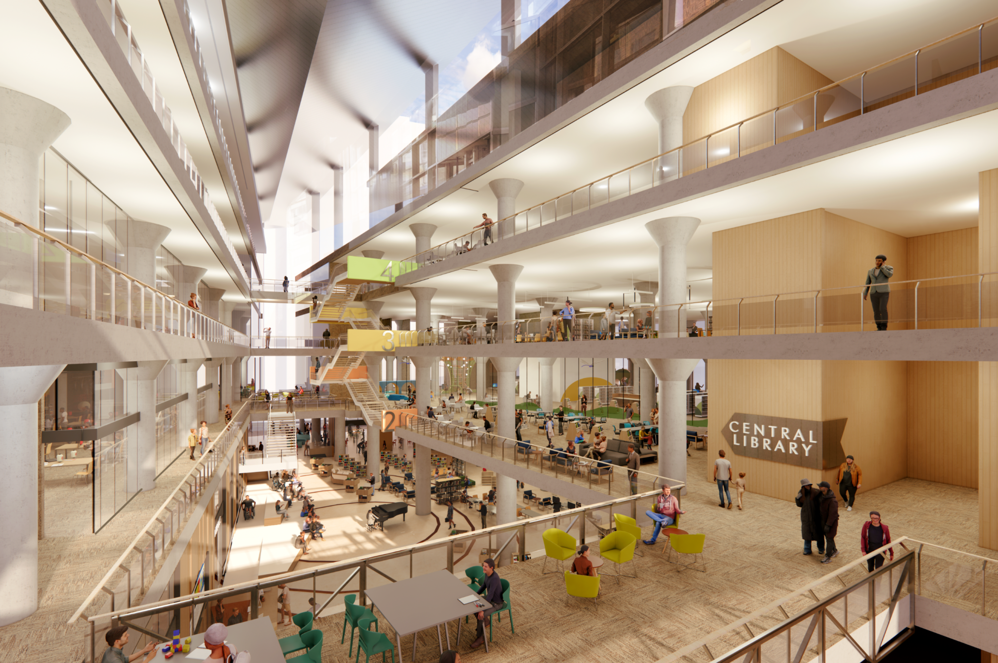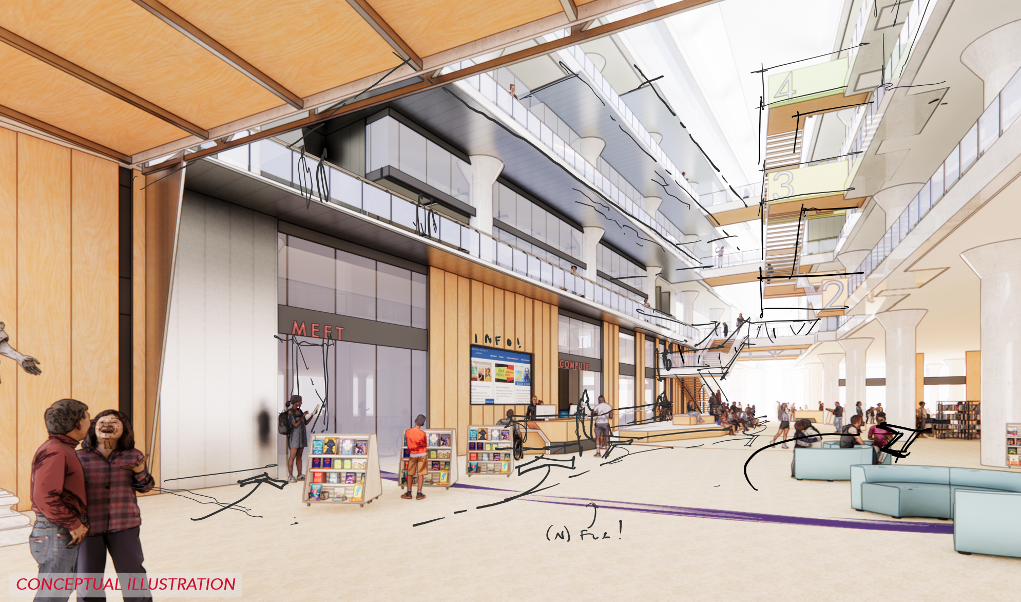 - Activating the atrium as a welcoming social hub with comfortable seating, a performance area, new atrium bridges, and highly visible library services.